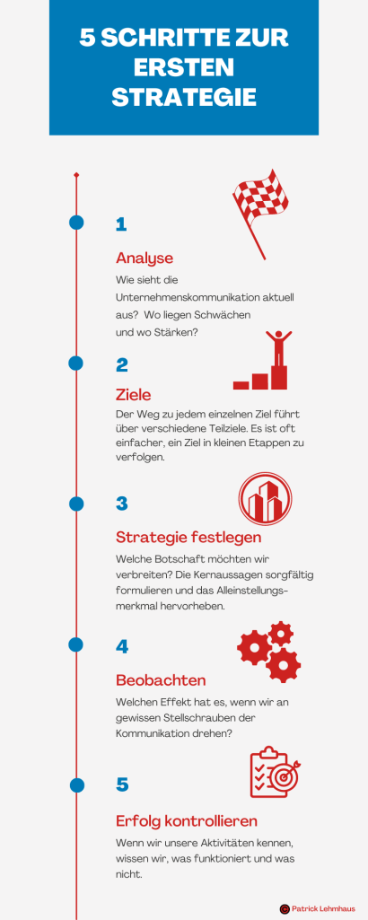 Eine Kommunikationsstrategie sollte jedes Unternehmen haben. Egal, ob wir ein mittelständisches Unternehmen sind (Friseure, Bäckereien oder Apotheken) – wir brauchen eine Kommunikationsstrategie, die festlegt, was wir unternehmen müssen, um unsere Ziele zu erreichen. Sie bildet somit auch die Basis unseres Marketings. Wie möchten wir uns positionieren, wie möchten wir vor unseren Kundinnen und Kunden, aber auch vor unseren Mitarbeiterinnen und Mitarbeitern auftreten? Diese Fragen sollte unsere Strategie beantworten.